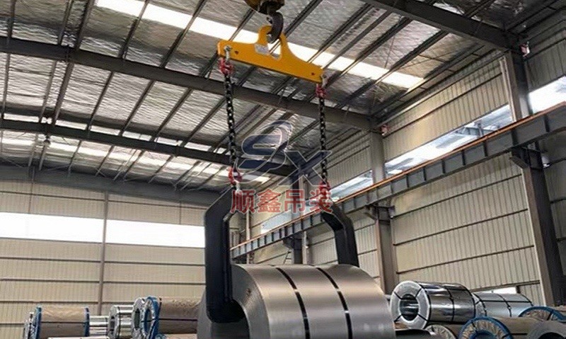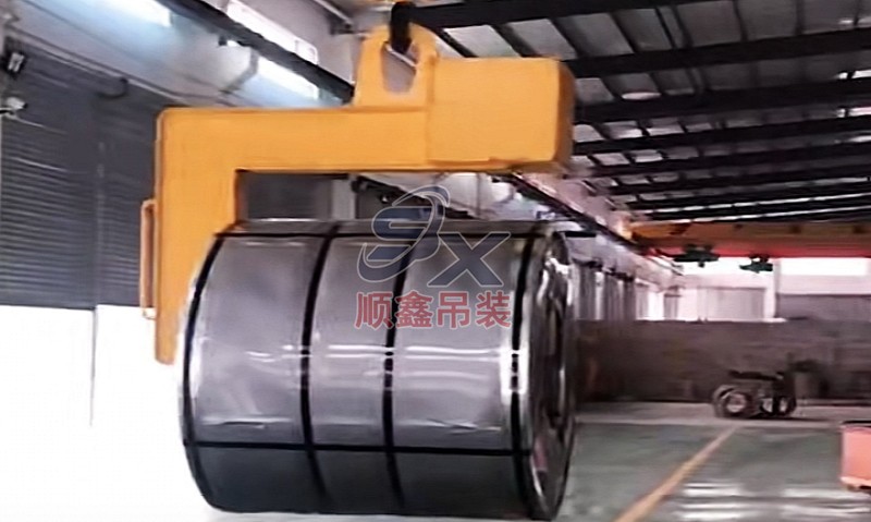 翻轉(zhuǎn)吊具通過(guò)機(jī)械剪力原理,對(duì)立式擺放的卷鋼進(jìn)行單邊抓取,來(lái)完成卷鋼的裝卸,當(dāng)改變重力點(diǎn)時(shí),可以對(duì)卷鋼進(jìn)行翻轉(zhuǎn),作業(yè)時(shí)不傷鋼卷。其吊耳采用加厚處理,焊縫飽滿(mǎn)牢固、延長(zhǎng)使用壽命。